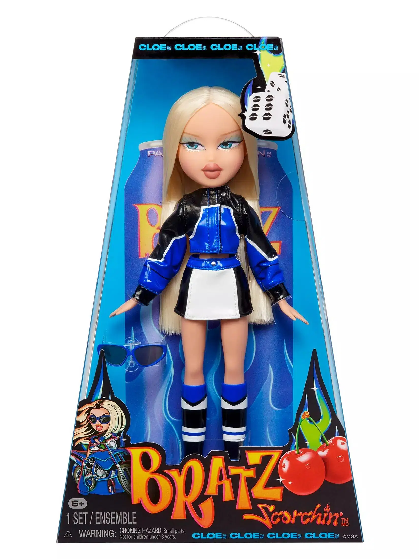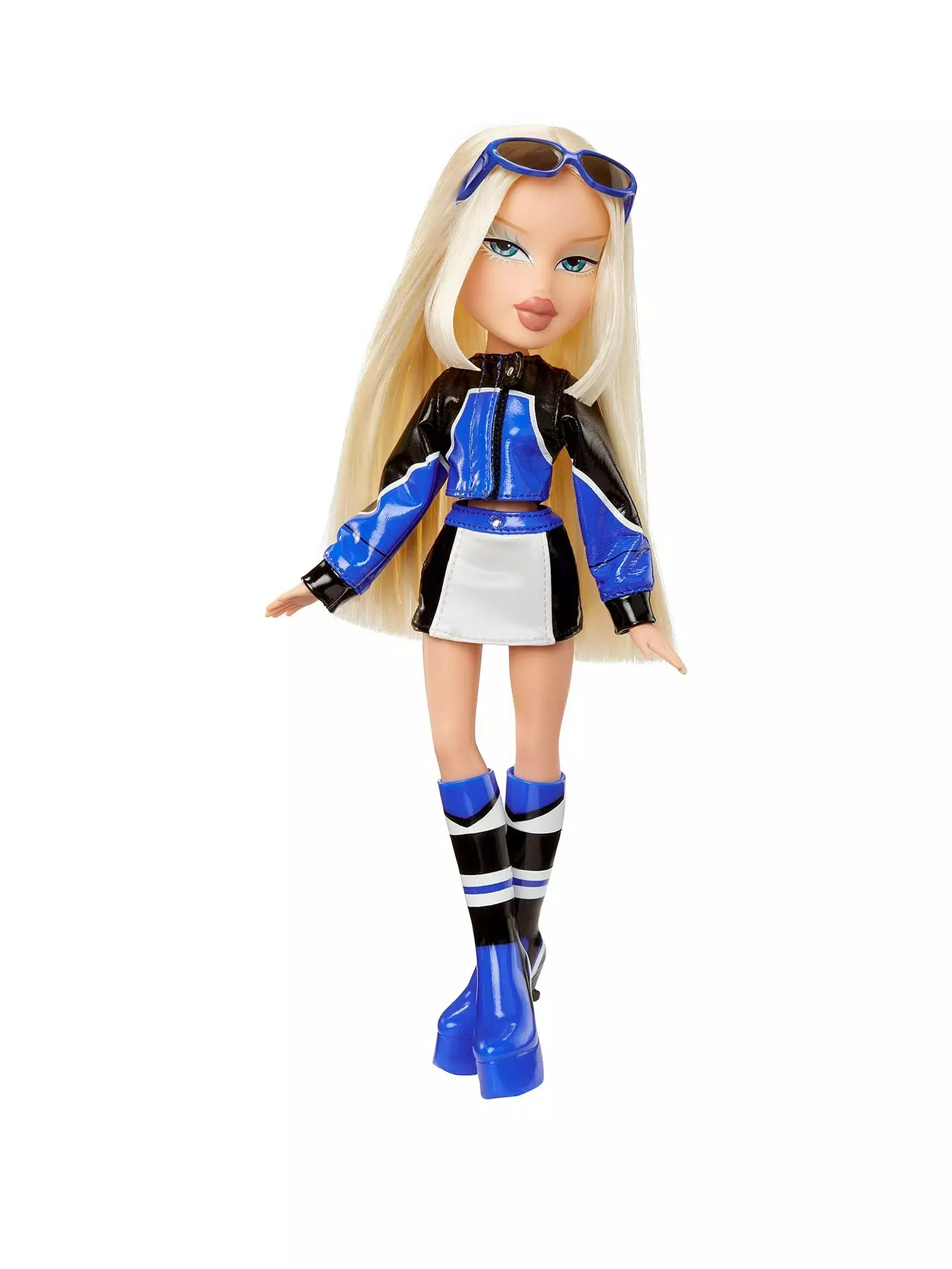 Bratz Scorchin Cloe ile sahne ışıkları maviye dönüyor. Siyah mavi kontrast ceketi, mini etek tasarımı ve dikkat çeken platform çizmeleriyle güçlü bir moda ifadesi sunar.