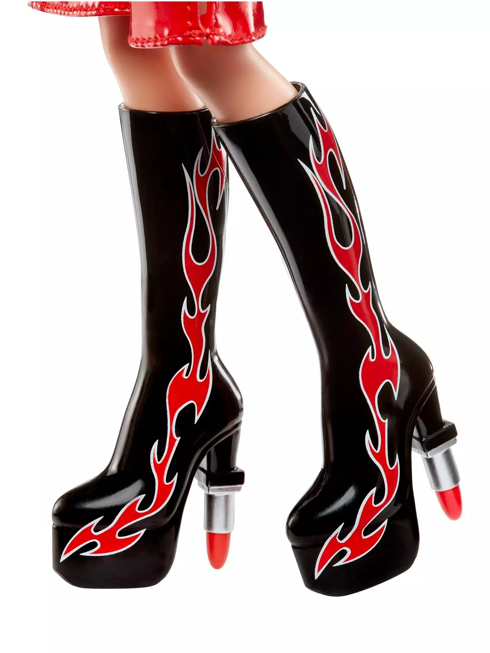 Bratz Scorchin Jade, cesur tarzı ve dikkat çeken kırmızı-siyah kombinleriyle koleksiyonun en iddialı karakterlerinden biri. Parlak vinil detaylı ceketi, şeritli kırmızı etek/pantolon tasarımı ve alev desenli platform botları ile güçlü bir stil sunar.