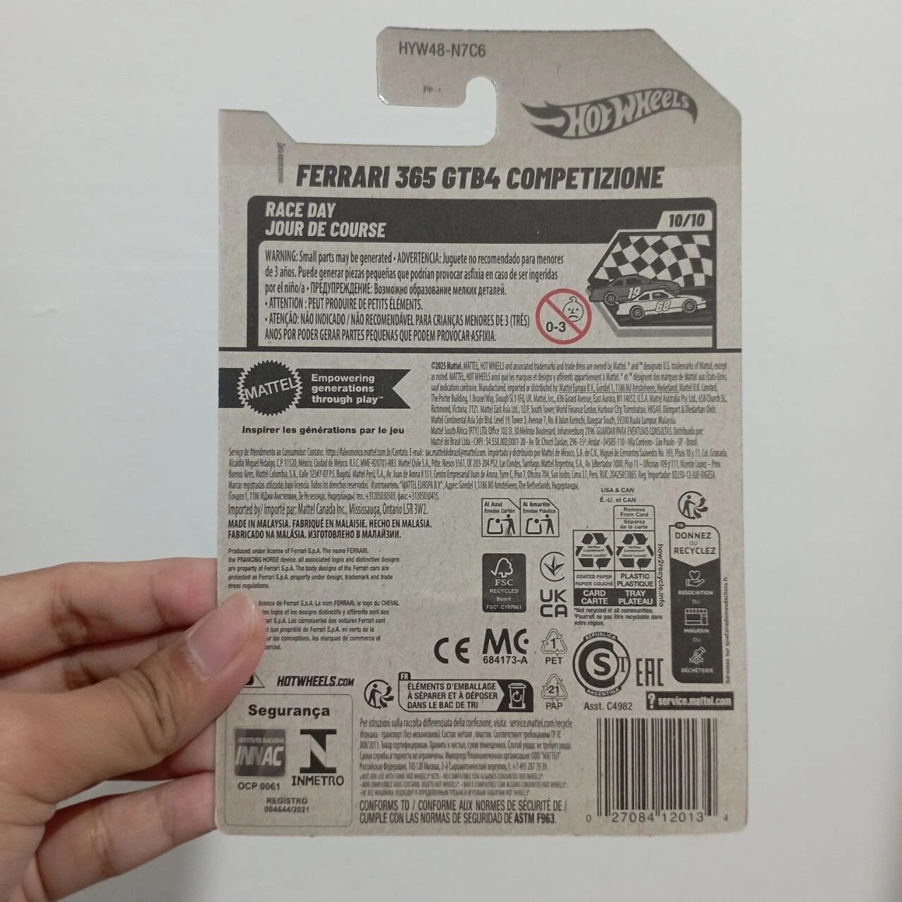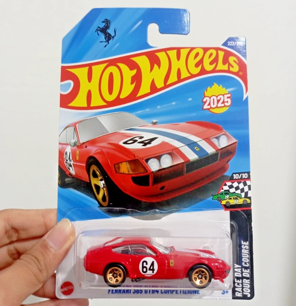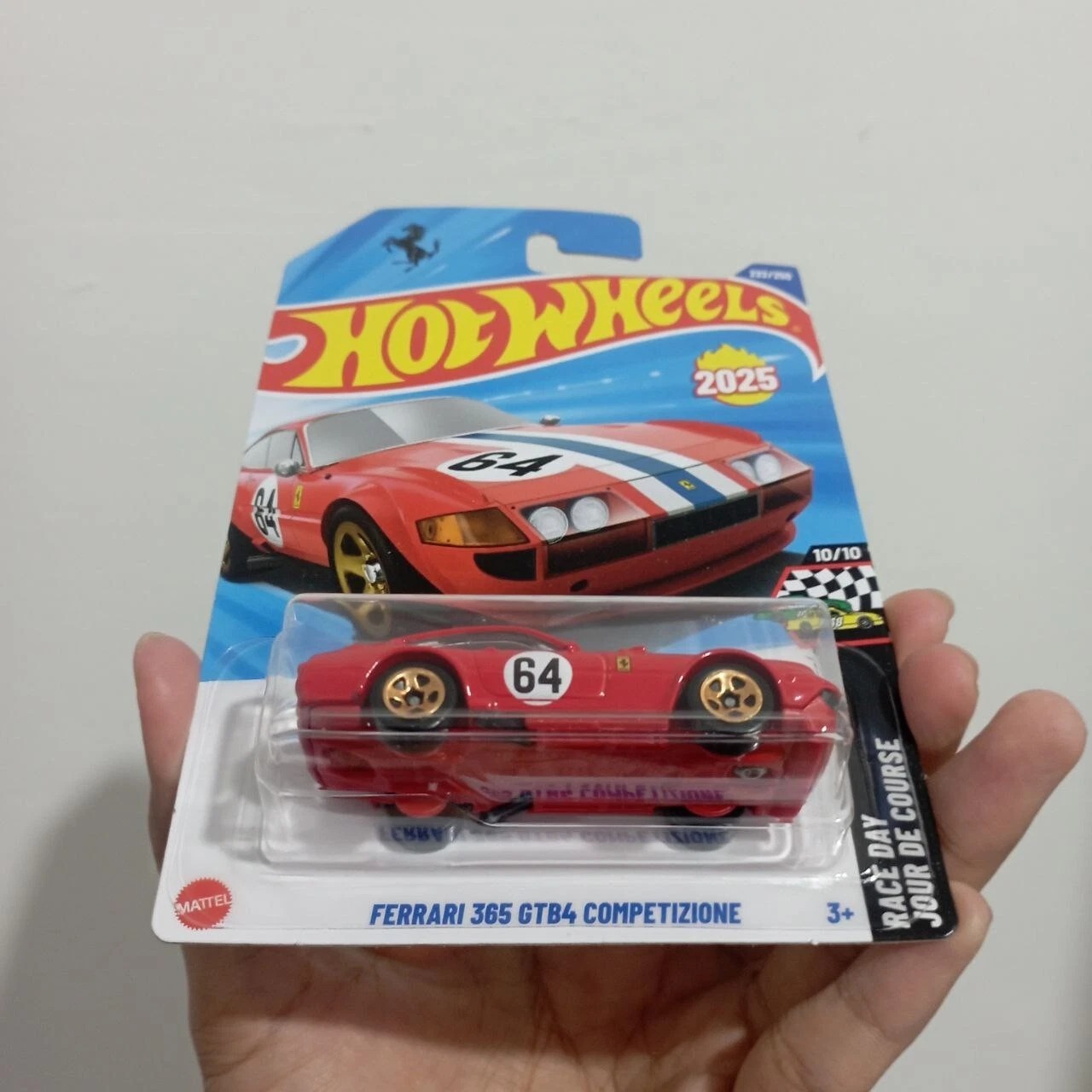 Hot Wheels 2025 serisinin dikkat çeken modellerinden Ferrari 365 GTB4 Competizione, yarış temalı “Race Day” serisinin 10/10 numaralı koleksiyon parçasıdır. Kırmızı gövdesi, detaylı tampon ve far tasarımı, beyaz-mavi yarış şeritleri ve altın renk jantlarıyla gerçekçi bir görünüme sahiptir.