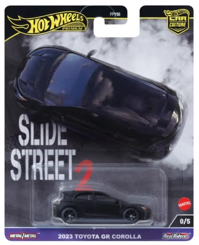 Hot Wheels Premium Car Culture Slide Street 2 serisinin özel 2023 Toyota GR Corolla Chase modeli koleksiyonerlere sunuluyor! Gerçekçi detaylara sahip 1:64 ölçekli bu die-cast model, Metal/Metal şasi ve Real Riders lastikler ile üretilmiştir.