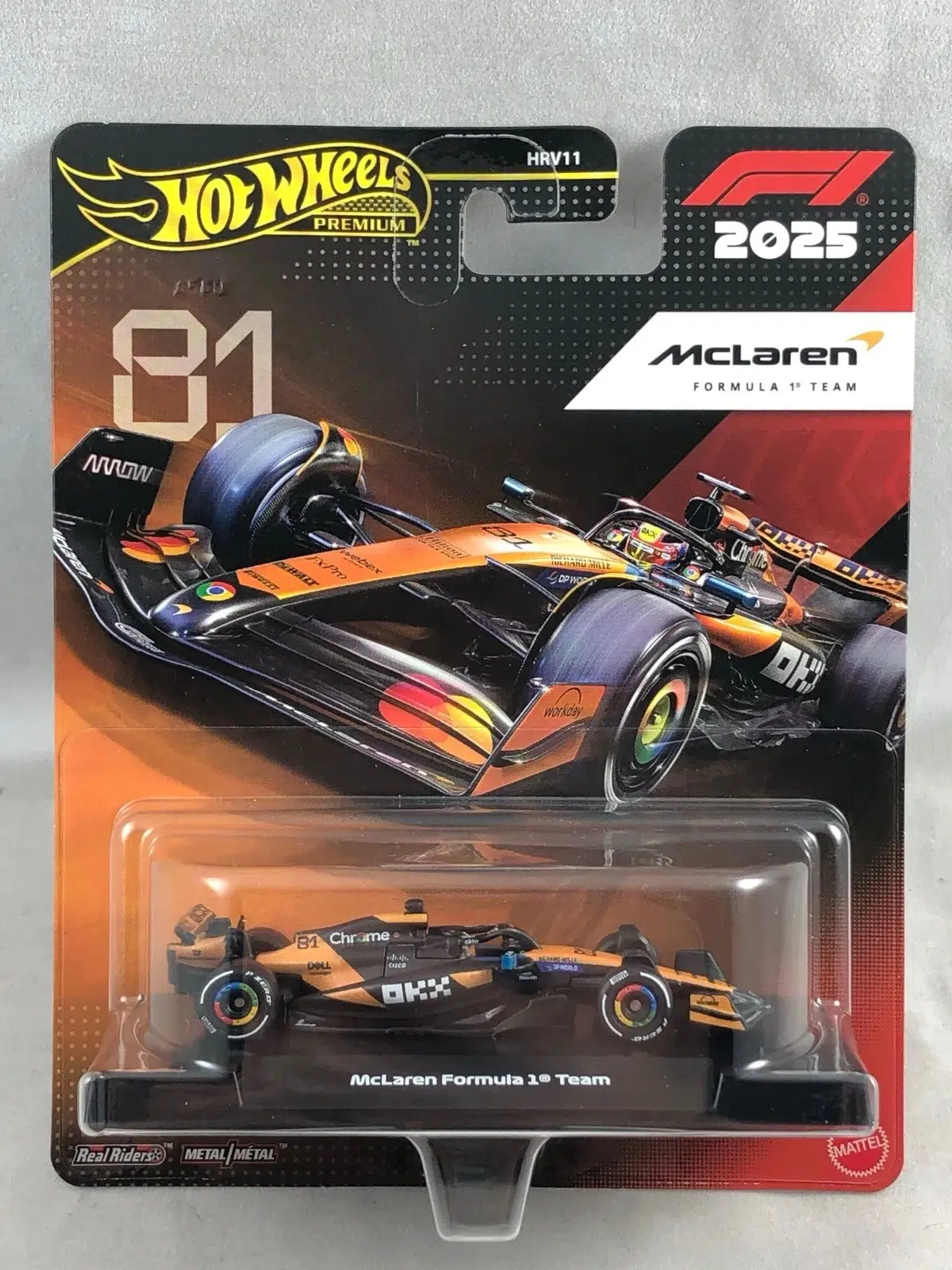 Hot Wheels Premium Formula 1 serisine ait bu özel model, 2025 sezonu McLaren Formula 1 Team aracını ve No:81 Oscar Piastri sürücü numarasını temsil etmektedir. Formula 1 tutkunları ve diecast koleksiyoncuları için detaylı şekilde üretilmiş koleksiyonluk bir modeldir.