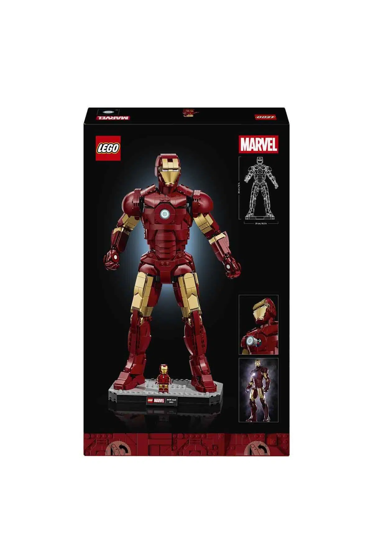• Boyutlar; bu 1297 parçalı yapım setinin Iron Man figürü, 38 cm yükseklikte, 21 cm genişlikte ve 11 cm derinliktedir.