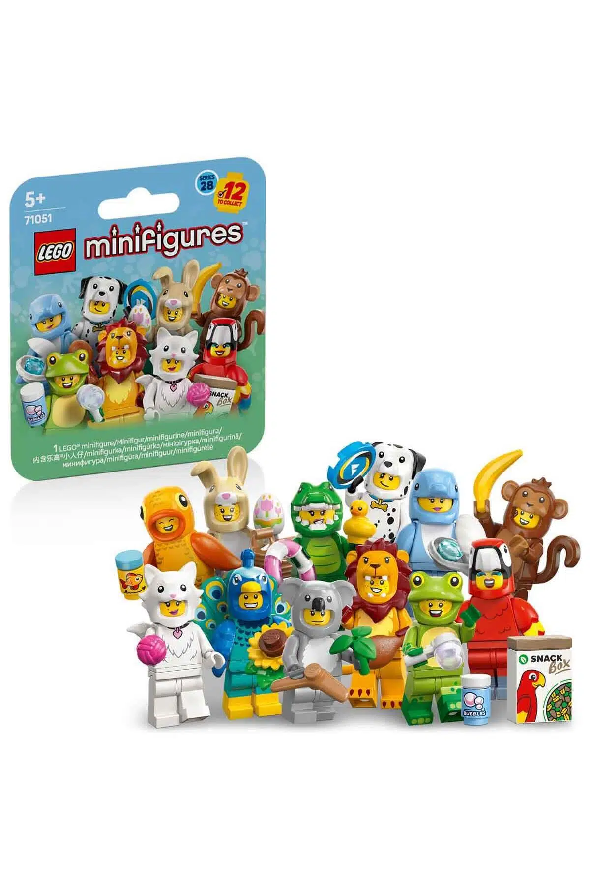 5 yaş ve üstü kız ve erkek çocuklar, LEGO Minifigures Hayvanlar Seri 28 (71051) küçük oyuncak hayvan gizemli kutularından 12 koleksiyon figüründen 1'ini seçerek eğlenceli hikayeler oynayabilir. Her kutuda 1 sürpriz LEGO mini figürü ve koleksiyonda toplam 12 karakter bulunur. Papağan, aslan, kurbağa, timsah, dalmaçyalı, Japon balığı, sevimli tavşan, tavus kuşu, tüylü kedi, koala, yunus ve maymun kostümleri giyen oyuncak figürleri içerir. 12 mini figürün her biri kapalı bir gizemli kutuda gelir ve hepsi en az 1 aksesuara sahiptir.