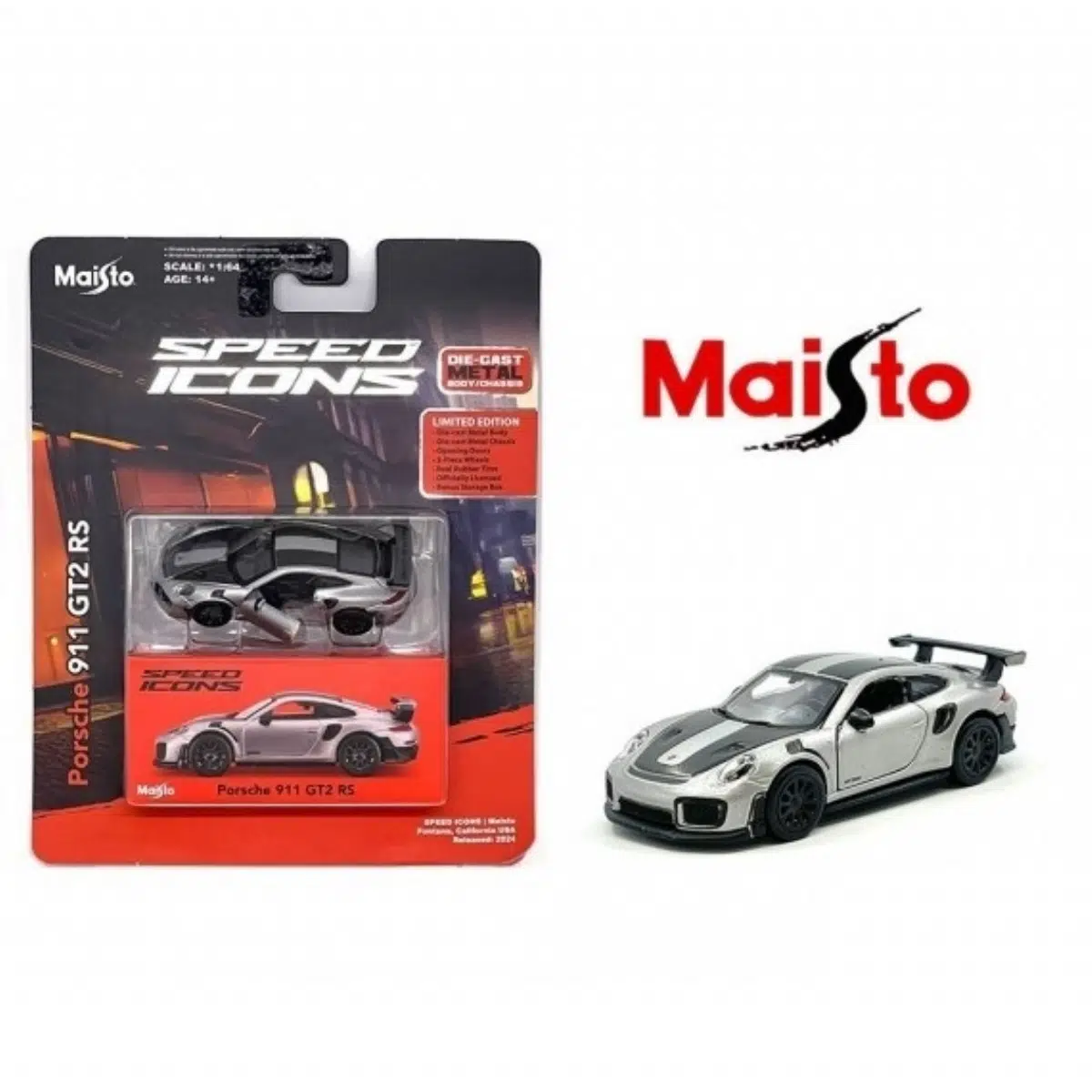 Maisto Speed Icons Porsche 911 GT2 RS, Porsche’un en güçlü ve ikonik modellerinden birini 1:64 ölçekte koleksiyonluk diecast kaliteyle sunar. Speed Icons serisine özel tasarlanan bu model, detaylı gövde yapısı ve sportif çizgileriyle vitrinlik bir parçadır.