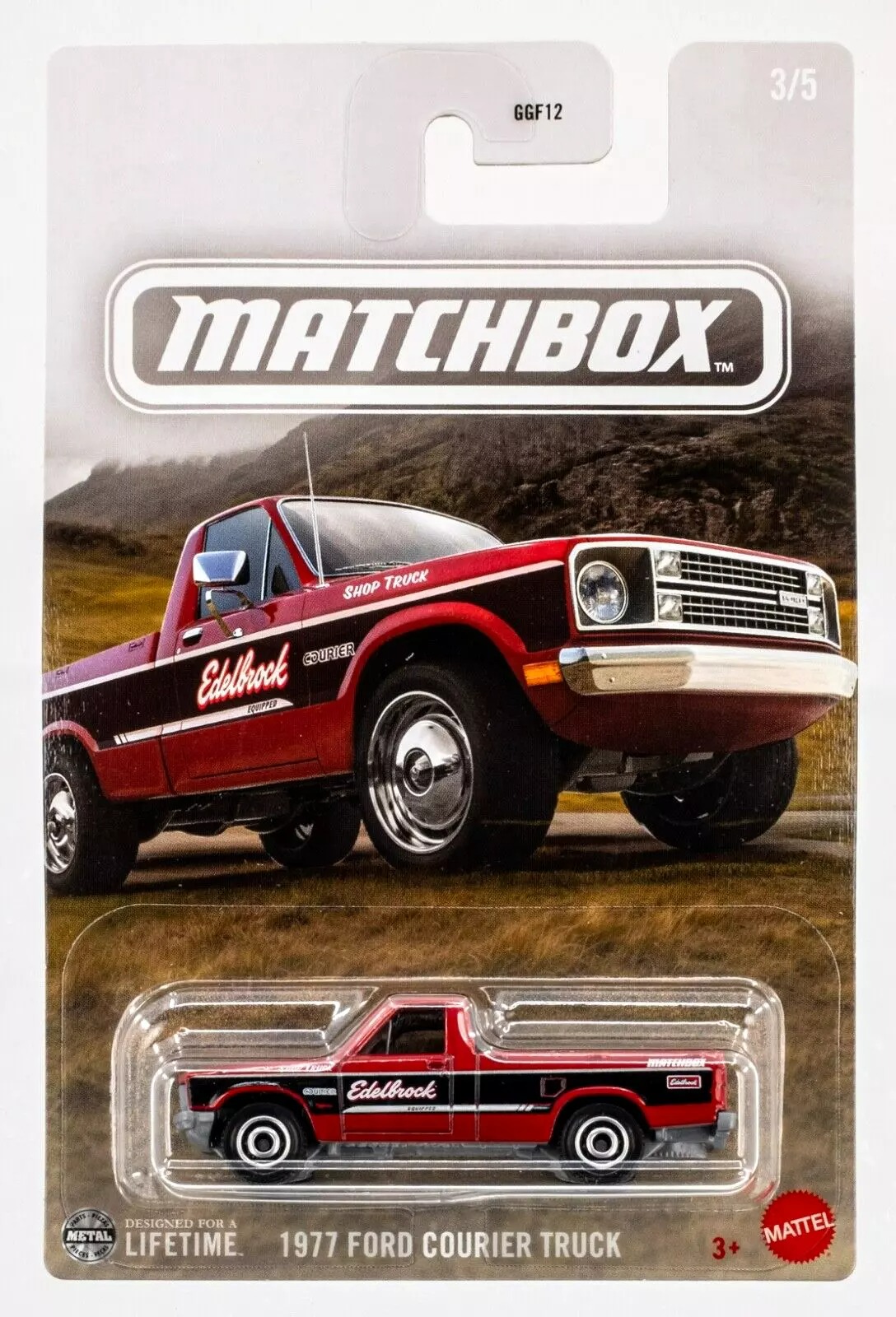 Koleksiyon tutkunlarına özel Matchbox 1977 Ford Courier Truck model araba! Retro tasarımı ve Edelbrock logolu kırmızı-siyah gövdesiyle dikkat çeken bu pickup kamyonet, klasik tarzı ve ince detaylarıyla öne çıkıyor.