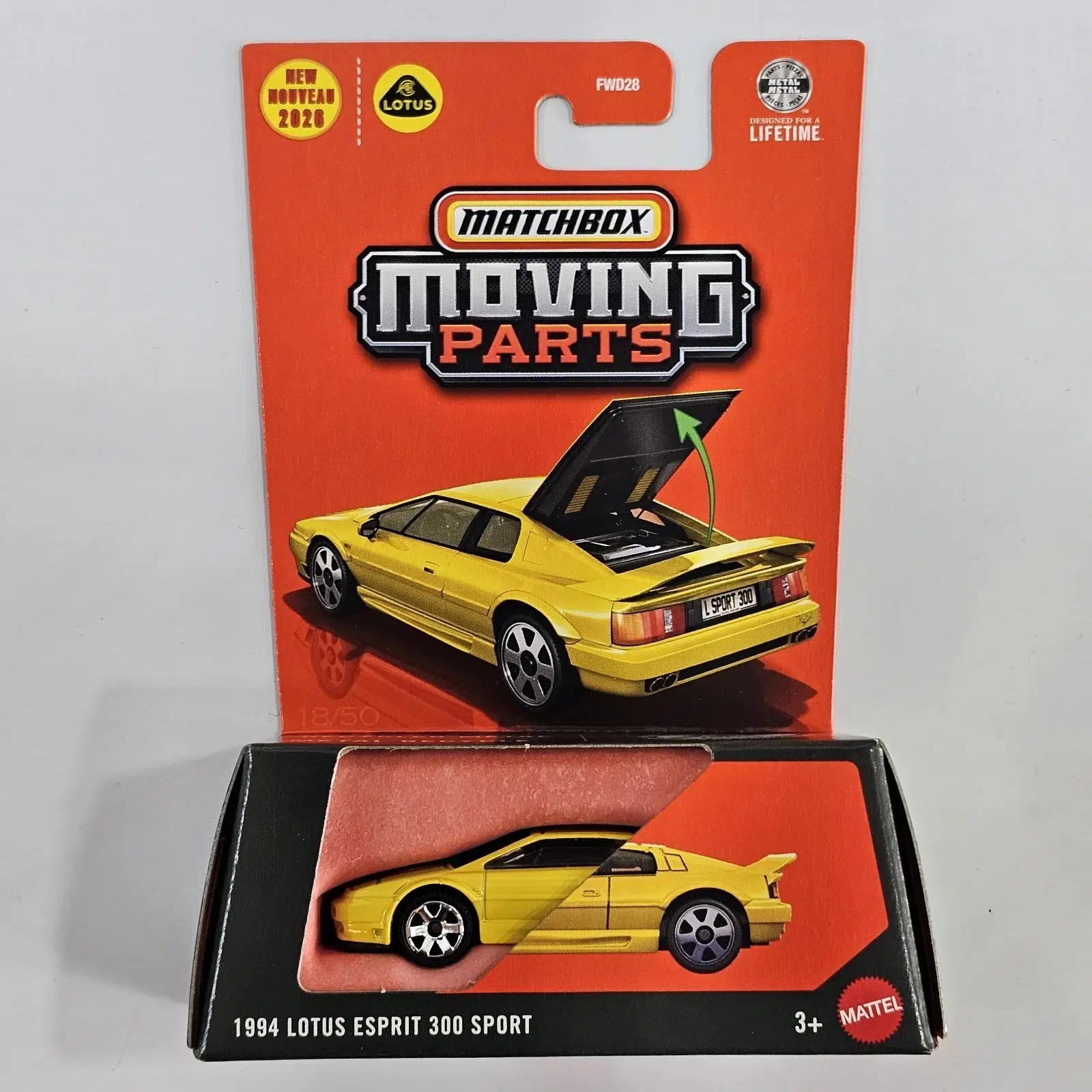 Matchbox Moving Parts serisine ait 1994 Lotus Esprit 300 Sport, açılabilir motor kapağı detayı ile klasik İngiliz spor otomobil ruhunu koleksiyon kalitesinde sunar.