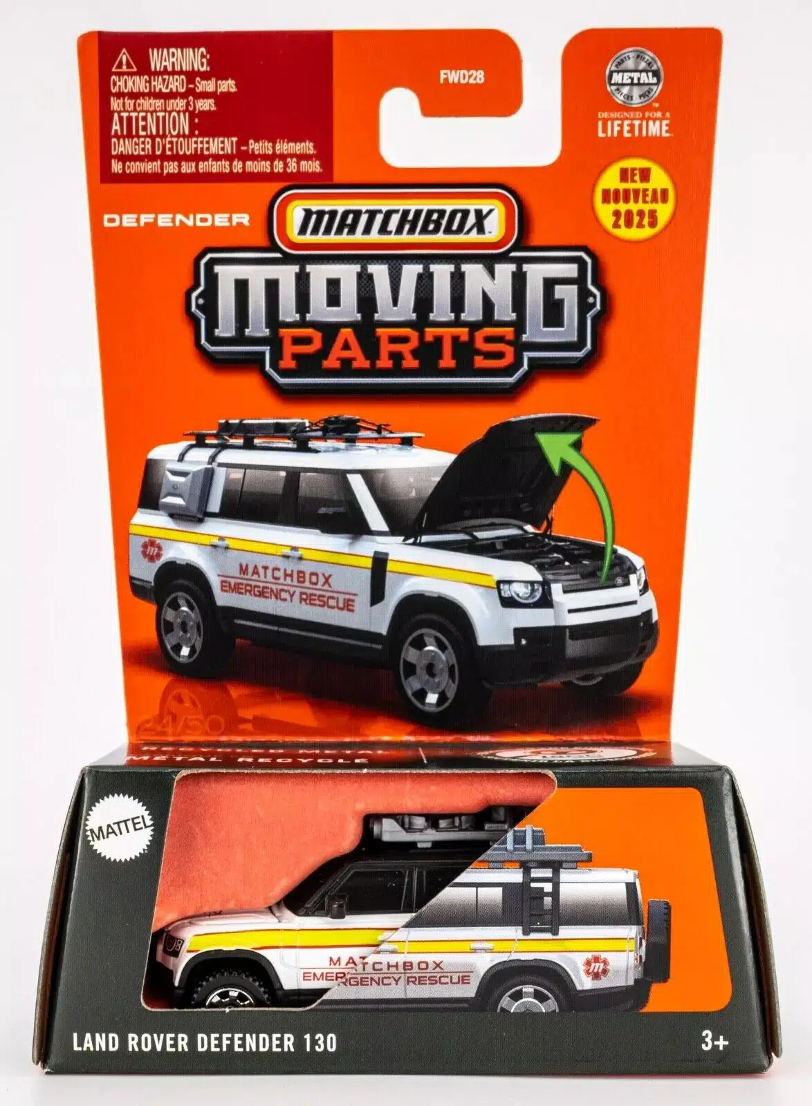 Modern arazi efsanesi Defender 130, Matchbox Moving Parts ayrıcalığıyla geliyor. Açılabilir kaput detayı sayesinde motor bölümü görülebilir — standart blister modellerden net şekilde ayrılır.