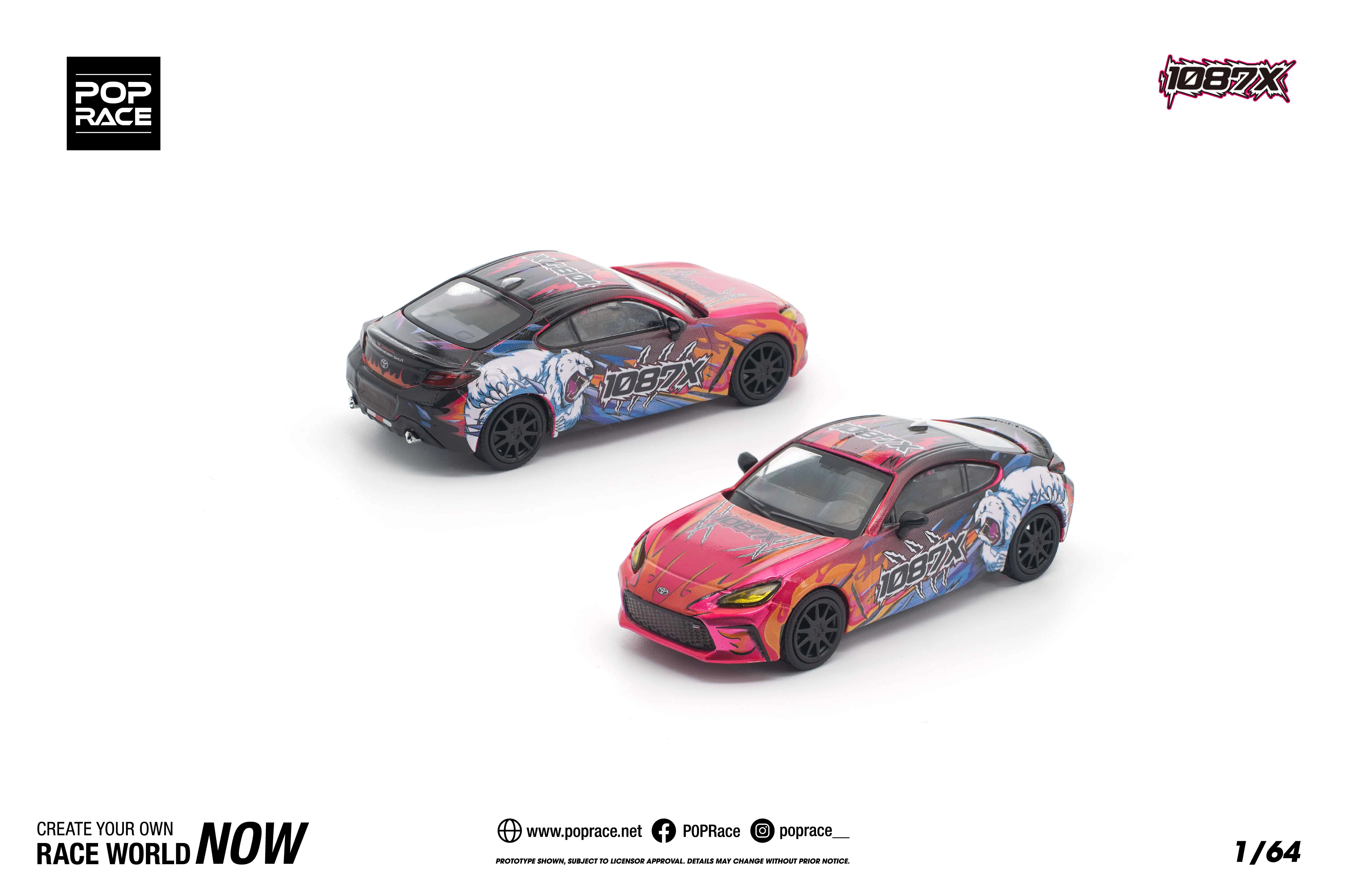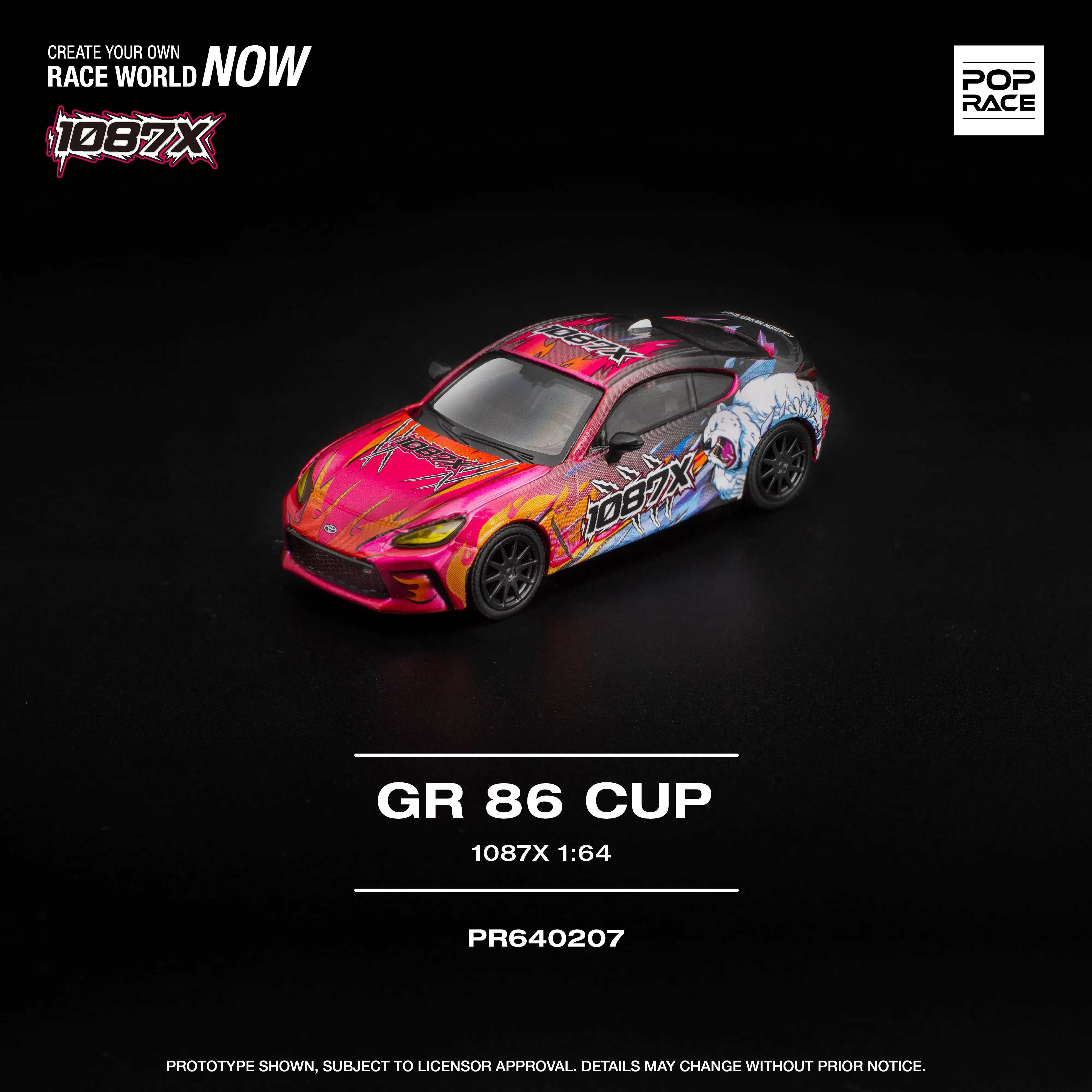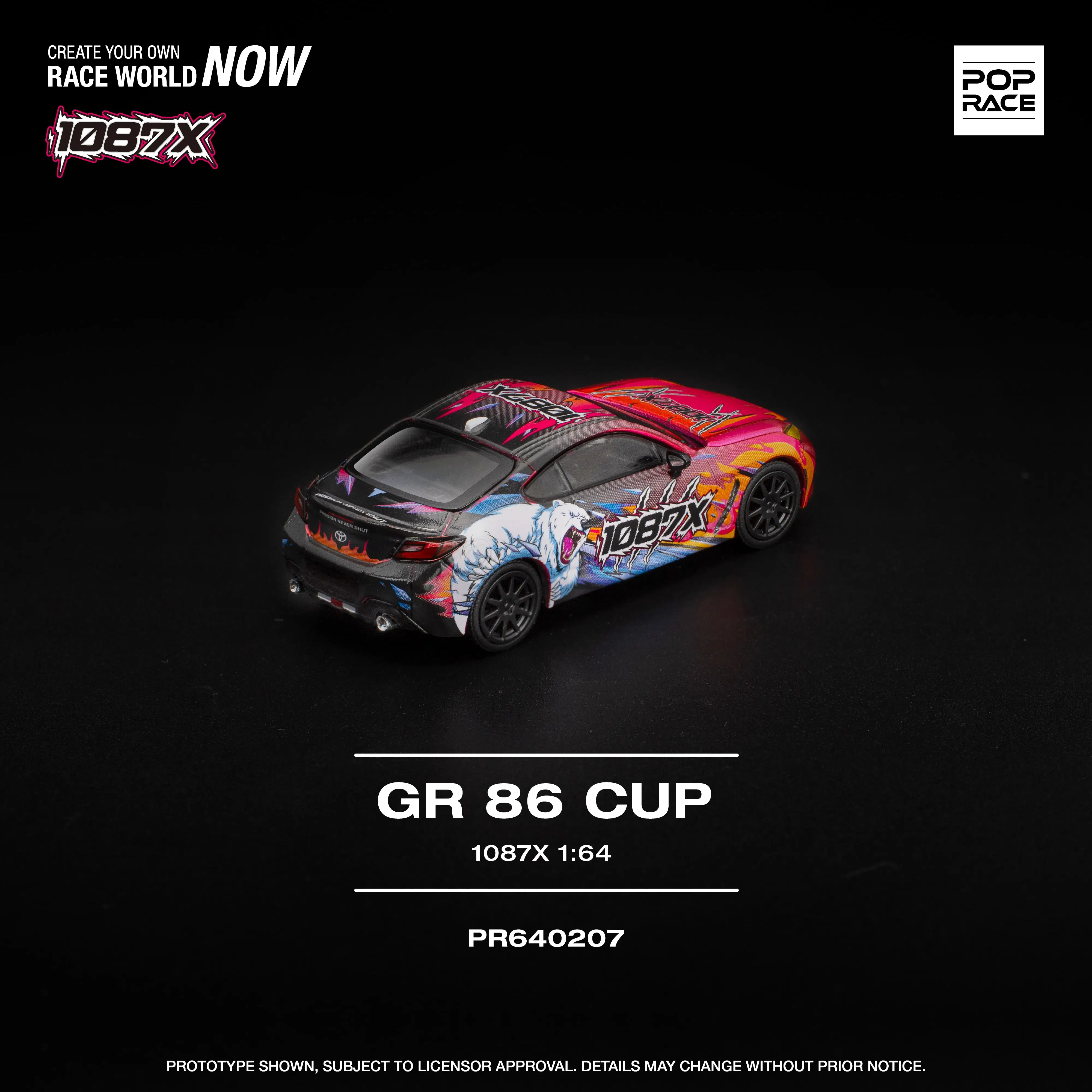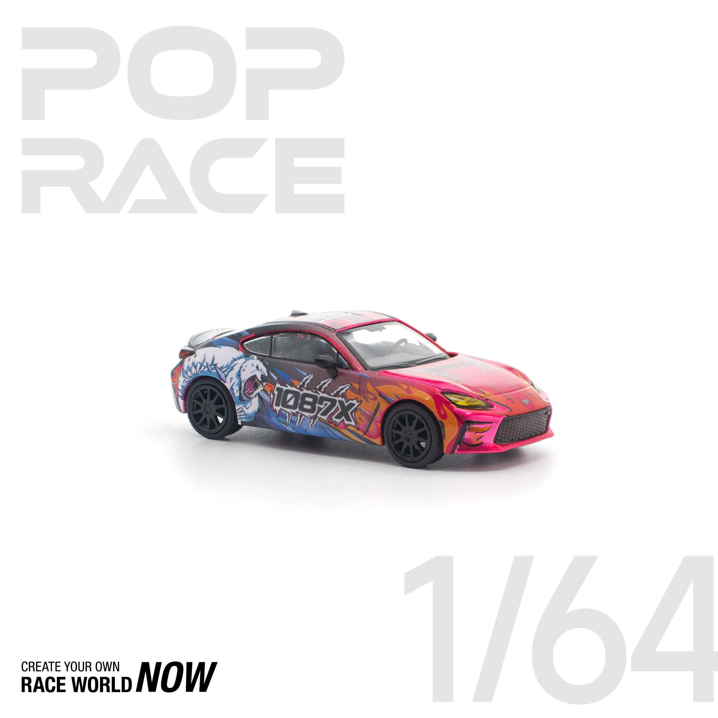 Toyota GR86 Cup gövdesi üzerine uygulanan 1087X grafik tasarımı; canlı renk geçişleri, karakter illüstrasyonu ve yarış ruhunu yansıtan detaylarla öne çıkar. Model üzerinde siyah jantlar, siyah tavan ve koyu renkli detaylar yer almaktadır.