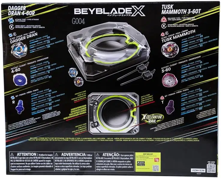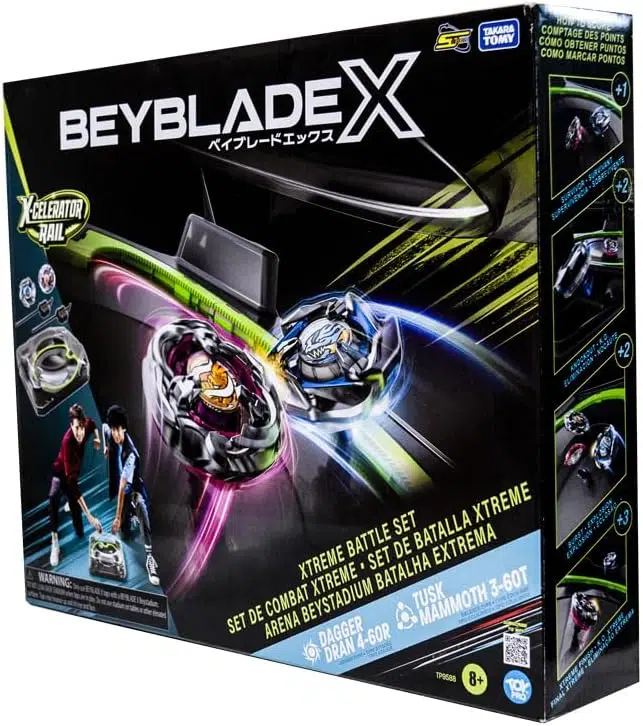 Takara Tomy Beyblade X Xtreme Battle Set ile çarpışma heyecanını zirveye taşı! X-Celerator ray sistemi sayesinde fırlatılan metal parçalı özel tasarım Beyblade toplar, yüksek hızda X-dash ile savaş alanını domine ediyor. Set içeriği: 1 adet orijinal BeyStadium arena, 2 adet güçlü Beyblade X top (Dagger Dran 4-60R ve Tusk Mammoth 3-60T), 2 adet kolay kavranabilir fırlatıcı ve 2 adet ipli mekanizma.